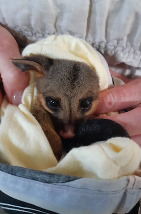425g male brushtail possum joey found in pouch of deceased mother by Dave Clarke. Photo by Shelley Clarke.