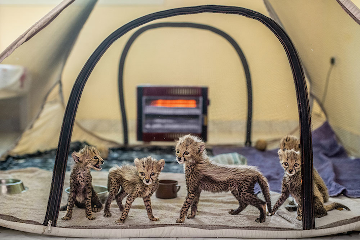 Cute—and rescued: These five rescued cheetah cubs are corralled in a tent in front of a heater. Just six weeks old, they require feeding every few hours. One veterinarian at a time serves as the primary caretaker for very young cubs, even sleeping next to them. The organization in Somaliland houses the region’s cheetahs confiscated from poachers and smugglers. Photo by Nichole Sobecki.