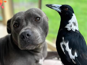 Instagram photo: Molly, the magpie, with Peggy, the Staffordshire bull terrier. |