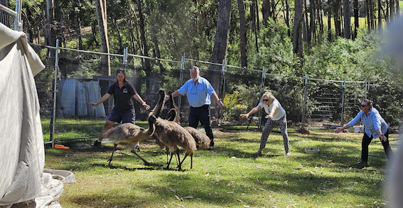 Rounding up four uncooperative emus onto a horse float for transport to a new home near Braidwood after care by Sandy Collins. Photo by Rachel McInnes. |