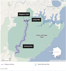 Range of the platypus reintroduced into the Royal National Park. |