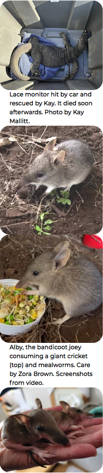 Loxy, 38g, and Roxy, 40g, bandicoot joeys, eyes just opening and challenging to raise so young. Care and photo by Debbie Ellis. |