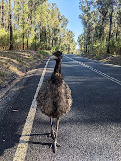 Photos: Emu on the road by Olympia Hendry and Olympia with the emu by Philip Hendry.. |