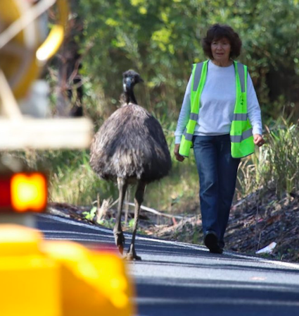 Olympia Hendry rescued an emu from Wheellbarrow Road near Burrill Lake. She walked and ran beside him to prevent him running in front of traffic and stopped traffic when necessary. Eventually, after a long time, she managed to guide him into the bush. |