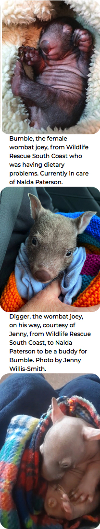 Berry, the wombat joey, “built like a tank and strong” in the care of Nalda Paterson. Now on her way to Wildlife Rescue South Coast. Screenshot from video. |