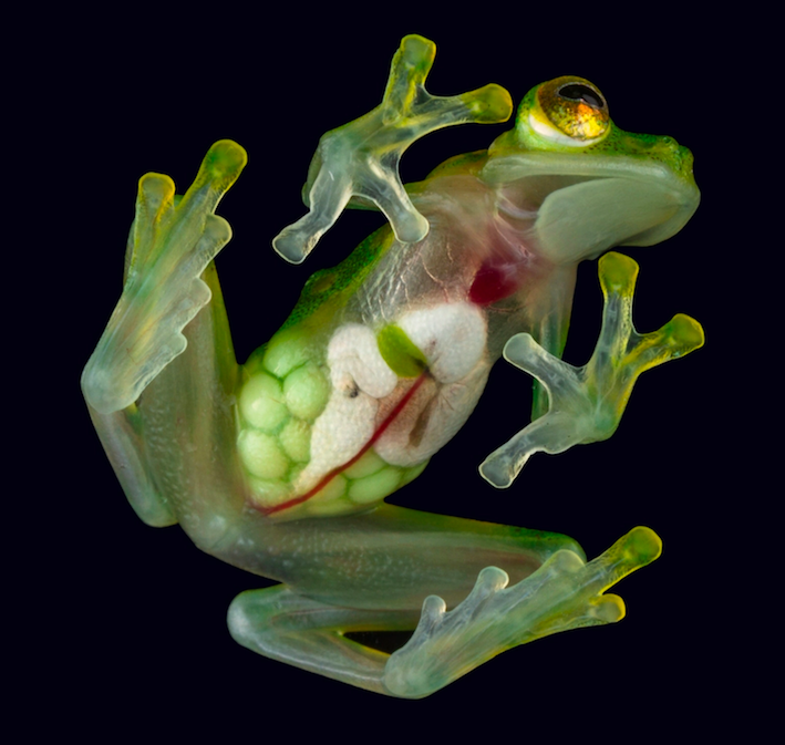 Photo: The eggs of a female sun glass frog are visible through her stomach by Jaime Culebras.