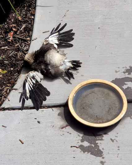 Baby magpie in care of Caza sunbathing. You can imagine what a fright she got. Photo by Caza Roberts.