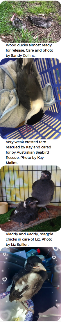Three wattlebird chicks reunited with their parents after being blown out of their nest and put in a box under a tree by a passerby. Mel made the box more comfortable and accessible by the parents and put it in the tree. Photo by Mel Davies.