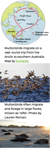 Millions of muttonbirds migrate from Australia in April each year flying to the northern sub-Arctic summer, and back in spring, travelling up to 35,000 km (see map).
