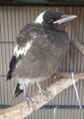 Magpie-lark chick in Janelle’s care, learning to perch. Photo by Janelle Renes. |