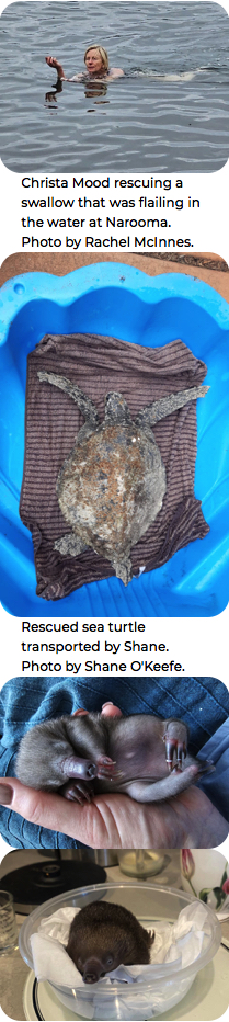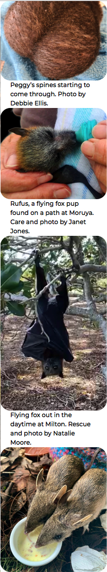 Peggy the puggle (baby echidna) rescued by Dave Clarke at Broulee beach and cared for by Shelley Clarke and then Debbie Ellis. Photos by Shelley Clarke and Renate Cooper. |