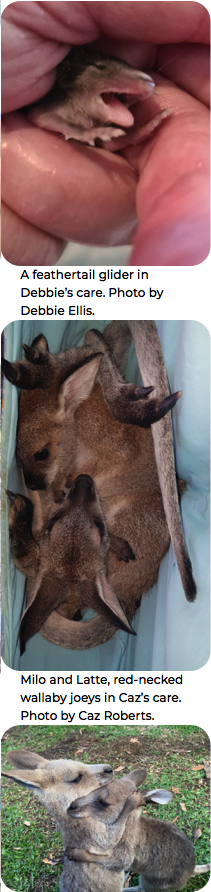 Jaxi and Woofi, kangaroo joeys rescued by Zora Brown and Caz Roberts. Care and photo by Renate Cooper. |
