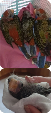Some of the 13 crimson rosella chicks rescued from a Mollymook subdivision where they were felling trees. Five were reunited with parents by Kylie Lopes and 8 (including a small 60g one) went into care with Janelle. They are now ready for release and flight fitness at Tim Barrass’s place. Photos by Janelle Renes. |