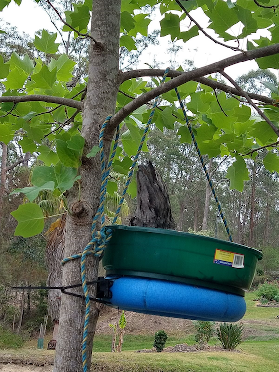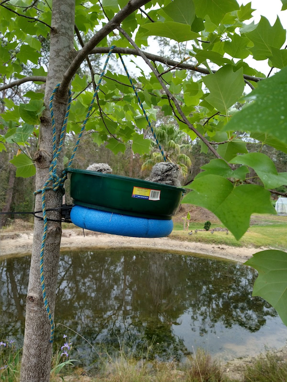A tawny frogmouth chick was found on the road in Bodalla. Rachel advised the member of public to put up a temporary nest in a nearby tree and to put the chick in it at dusk. The next night a second chick was found and placed in the nest. The parents are now feeding the chicks in the new nest. Photos and story by Rachel McInnes. |