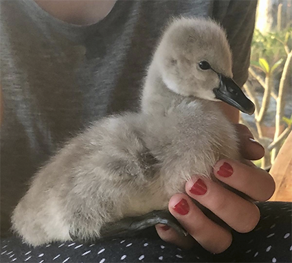 Nina, the black swan cygnet (left), mistaken by a local for a duckling, was delivered to Zora on 19th November. She searched for Nina's parents for several days without luck.