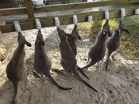 Six happy kangaroo joeys at Lorita and Kevin Clapson’s place, transferred from Sandra Doyle and Olympia Hendry. Photo by Lorita Clapson. |