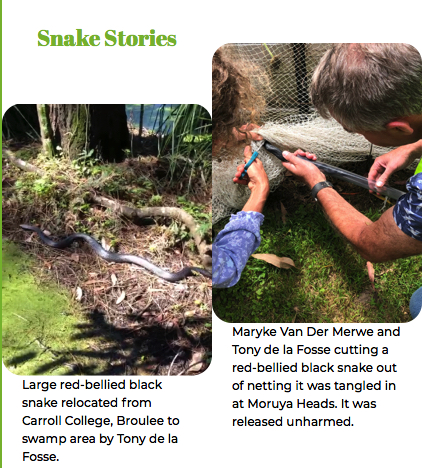Tony de la Fosse relocating a red-bellied black snake from a sofa bed at Moruya to Waldron’s Swamp about 500m away.
