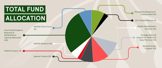 WIRES has allocated a fund of $90 million to projects, with over 20% of funds expended by October 2023 and the remaining funds committed to be spent in the future. Note the majority of the money is for increasing capacity for wildlife research, rescue and rehabilitation nationally rather than support for existing volunteers.