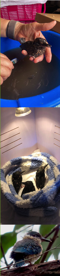 Kingfishers being cleaned, dried and then released. Photos by Zora Brown and Margot Hadfield |