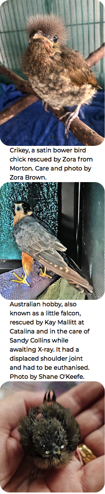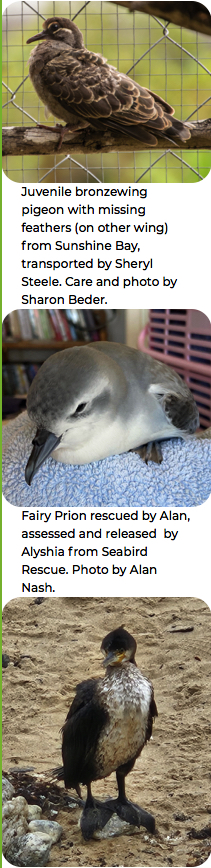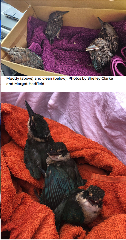 Four juvenile kingfishers were found at South Durras caked in mud (see below). They were rescued by Shelley and Dave Clarke, then driven north to be cleaned up by Margot Hadfield with the help of Zora Brown and Bella. They were dried in an incubator and kept overnight before being driven home and released by Margot. They flew up into the trees to be reunited with their parents. Thanks to everyone who advised and assisted; a fantastic team effort.