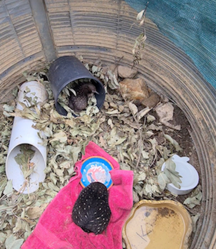 Priscilla (black) is powering on and will be released soon. Pugsley (brown) has had a few weight problems but is now gaining weight again. Priscilla and Pugsley enjoy each other’s company and in the photo above are cuddling up whilst sun-baking. |