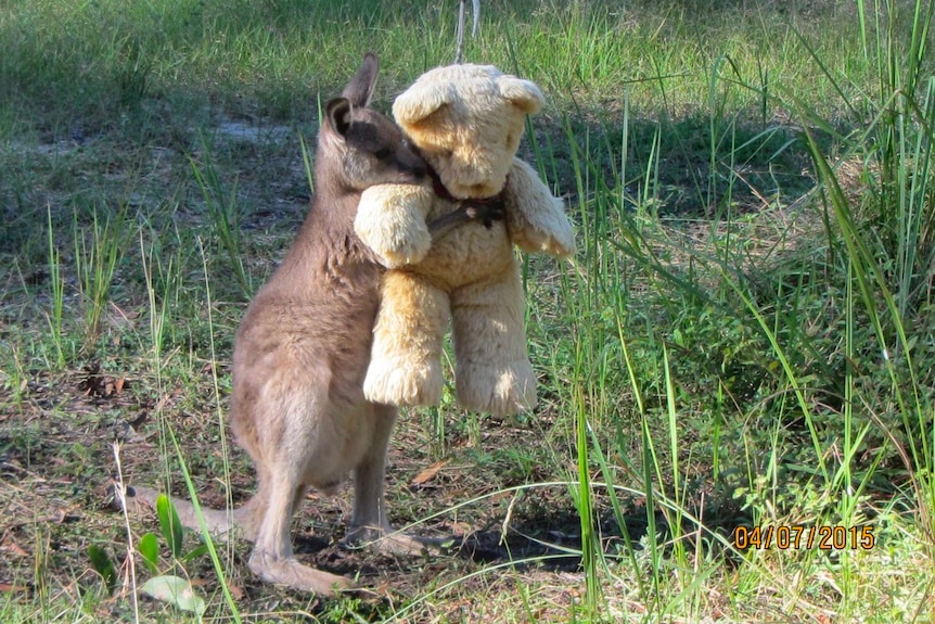 An orphaned eastern grey kangaroo joey with his teddy bear on a rural property near Grafton in northern New South Wales. Photo by Gillian Abbott. |