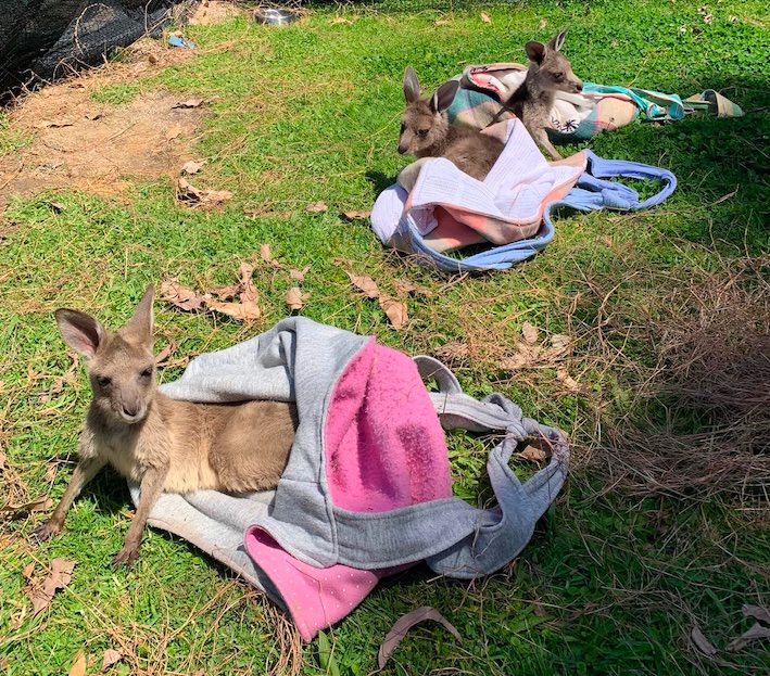 Sushi, Haru and Mia, kangaroo joeys at Sandra’s place. Photo by Sandra Doyle. |