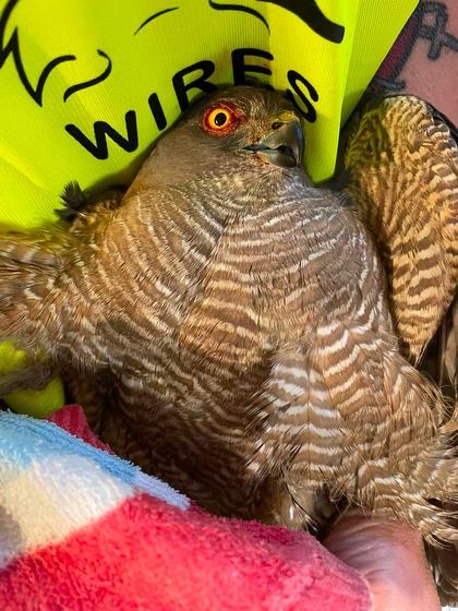 Collared sparrowhawk rescued by Anica Jabkiewicz, treated by Anica and Sandy for severe bruising and an injured eye, released after a week in care. Photo by Sandy Collins. |