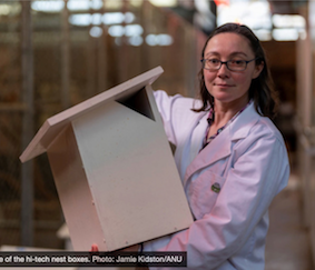 Dr Kara Youngentob with one of the hi-tech nest boxes. Photo by Jamie Kidston