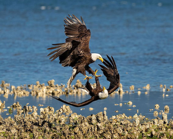 Head over talons: Bald eagles perform a “death spiral” courtship cartwheel along Washington State’s Hood Canal in a recent post on National Geographic Travel’s Instagram. The bald eagle population has rebounded significantly since the mid-1960s, when the birds were on the brink of extinction. However, a recent study found that more than half of the adult birds today have chronic lead poisoning from ammunition. Photo by Stephen Matera. |