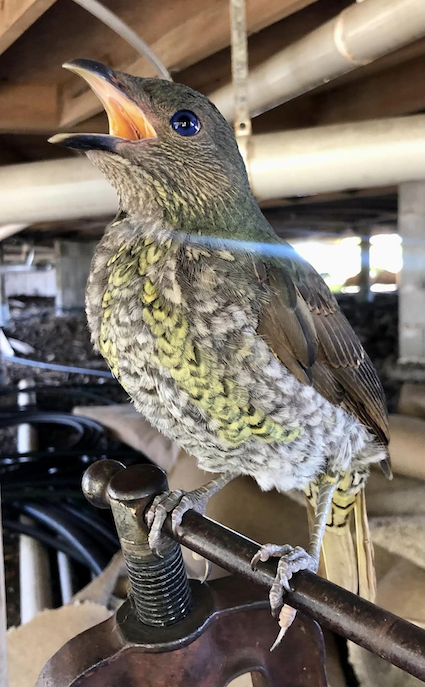 Frizzle, the satin bowerbird chick when he came into care and 7 weeks later. Care and photo by Zora Brown |