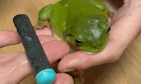 When a family at Balgal Beach (near Townsville) found a resident green frog was a funny shape they called in Trish Prendergast, a veterinary nurse and reptile coordinator for the North Queensland Wildlife Centre. She removed the Nerf gun dart, which was as long as the frog.