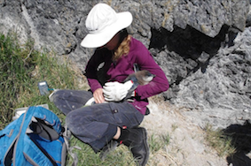 Seabird ecologist Lisa O’Neill microchipping a little penguin chick at Snapper Island in the Clyde Estuary. |