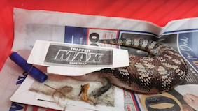 Photograph: Blue-tongued lizard in a sock by Doug Gimesy