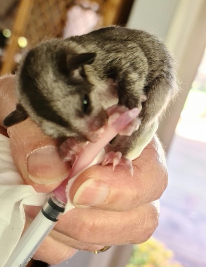 ‘Branxton’, squirrel glider joey at 19g and 43g (bottom) in care of Debbie. Photos by Debbie Ellis.