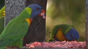 Rainbow lorikeets eat meat from a backyard feeding station. |