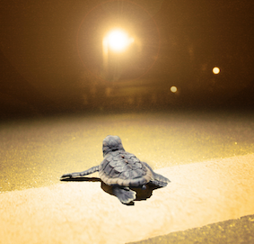 Photo: Hatchling loggerhead sea turtle in Florida, USA, moves away from the sea towards road lights. |
