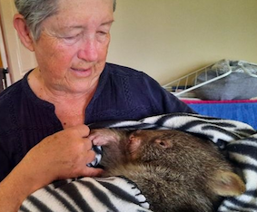 Photo: Rossco, the orphaned wombat joey with Heather Brown. |