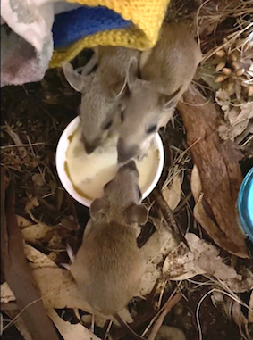 Bandicoot joeys, Pixie, Percy and Paddy enjoying a mixture of kangaroo milk, mashed banana, high protein powder and InsectaPro. They were rescued and initially cared for by Olympia Hendry, before going into Zora Brown’s care. Screenshot from video.