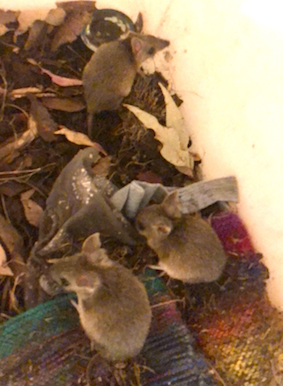 Bandicoot joeys love sleeping together in a small woollen pouch on leaf litter and soil. An inner pouch is changed regularly as needed and the soil needs to be changed daily.