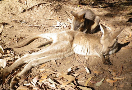 "Buddies Napping”. Larry, the swamp wallaby joey, and Gucci, the eastern grey kangaroo joey, in the care of Beris. Photo by Beris Jenkins.
