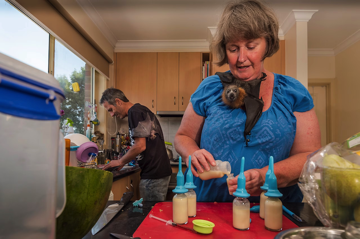 Julie and Graeme, two wildlife caretakers, prepare a meal for several recently orphaned gray-headed flying fox pups. In the wild the young would be hanging on their mother, but under care, they direct their affection and clinginess toward humans. Photograph by Doug Gimesy in National Geographic.