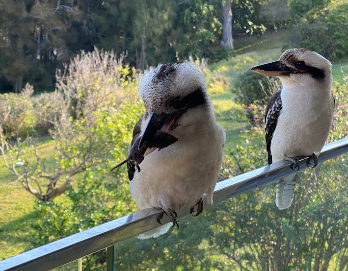 Kookaburra with antechinus, gifted from the other kookaburra (its mother?), at Malua Bay. Photo by Jenny Willis-Smith.