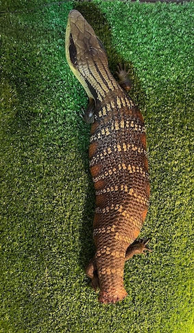 Blue tongue lizard, victim of a whipper snipper, was given surgery and is now recovering in the care of Sandy Collins. Photo by Shane O’Keefe.