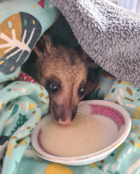Ginger, a brushtail possum joey, lapping her milk. Care and photo by Debbie Ellis.