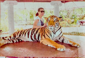 For $10, tourists can pose with this tiger at Phuket Zoo in Thailand. The tiger is held by a short chain and can’t stand up. Tigers may be declawed, or even drugged, to protect the tourists. Photo by Kirsten Luce.