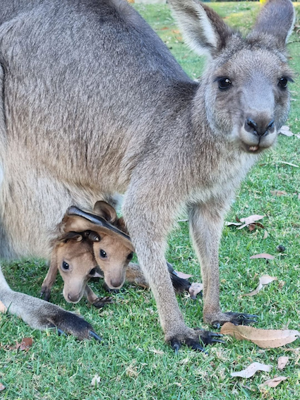 Pip, an eastern grey kangaroo reared by Lorita and Kevin, with her twin joeys. Photo by Lorita Clapson.